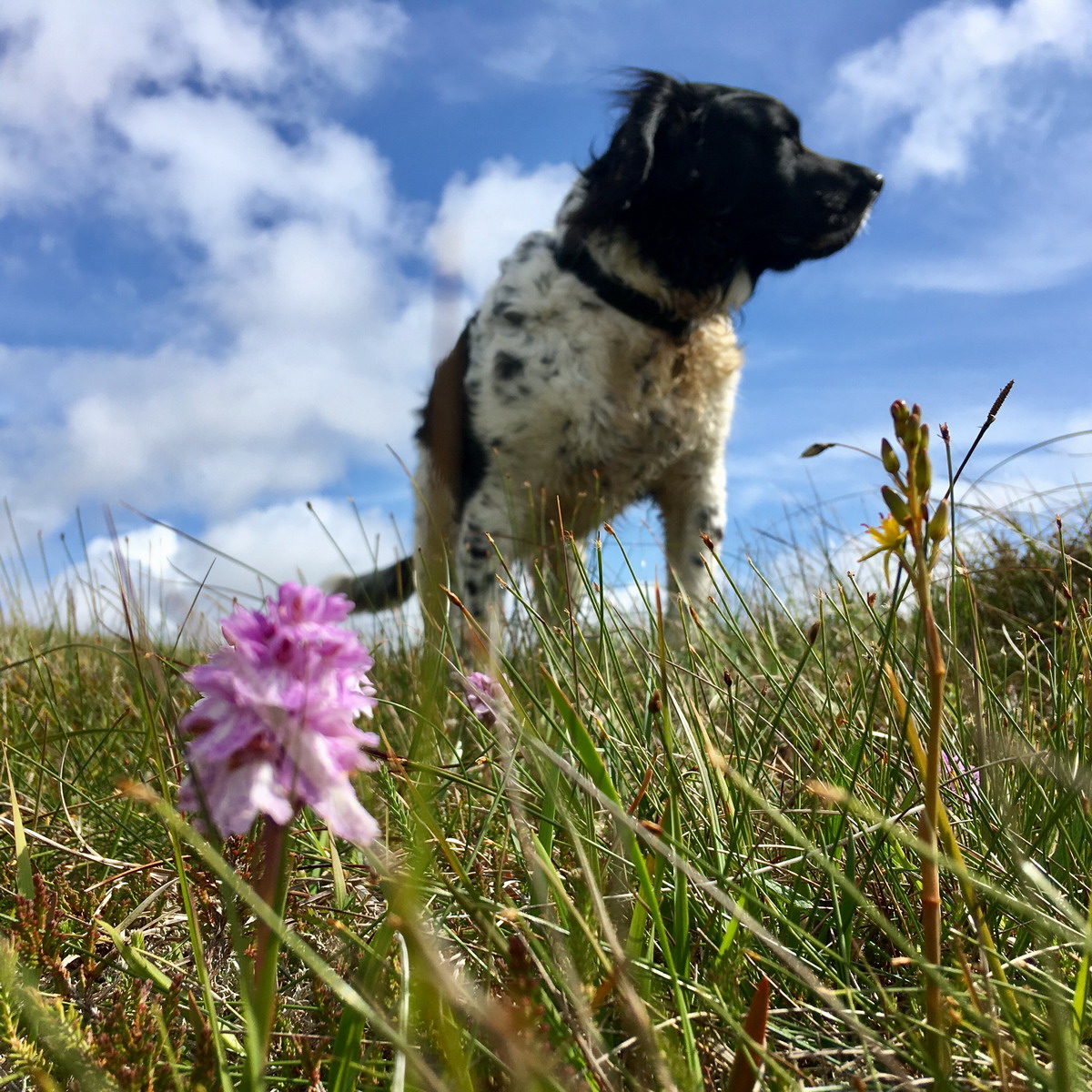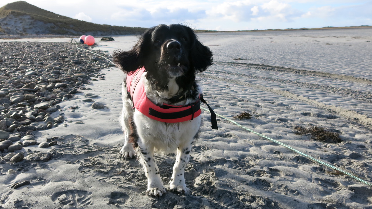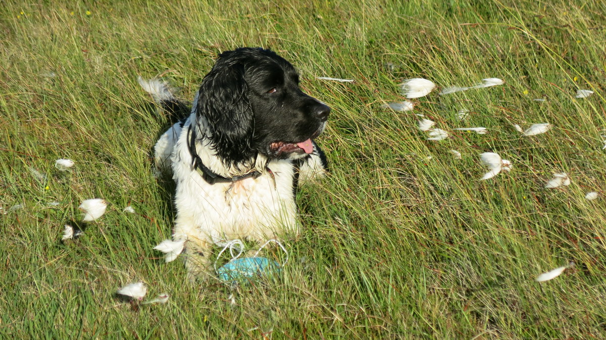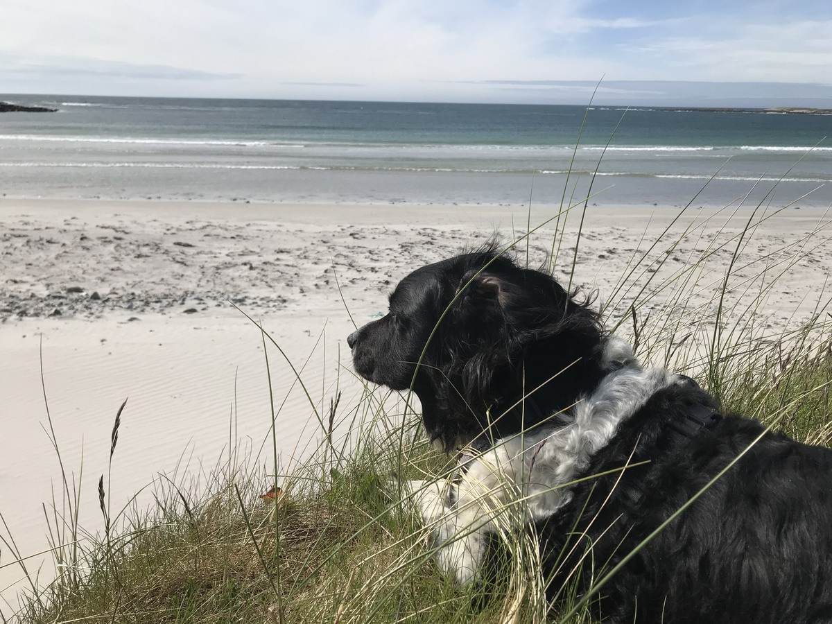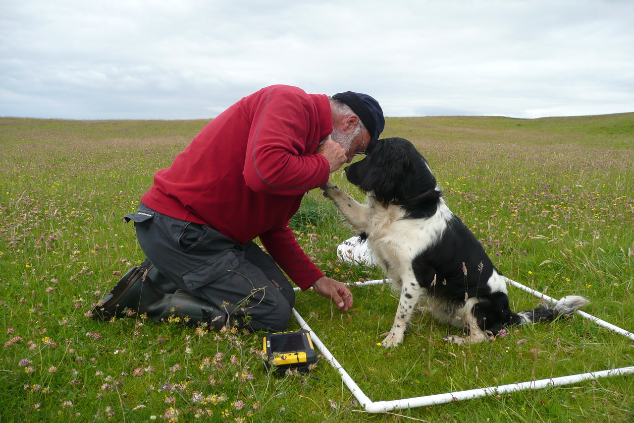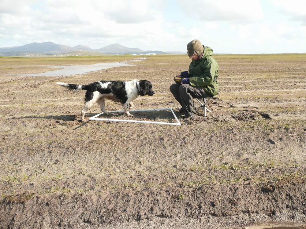 I am a working dog. I brought my special gun dog skills to the Island. I surveyed birds, counted machair flowers, located wild goose eggs (under licence), assisted in sheep shearing, guarded ripe corn from the hooligan geese and looked after Wee Boss on wild and windy ferry journeys and in all other ways dogly possible.